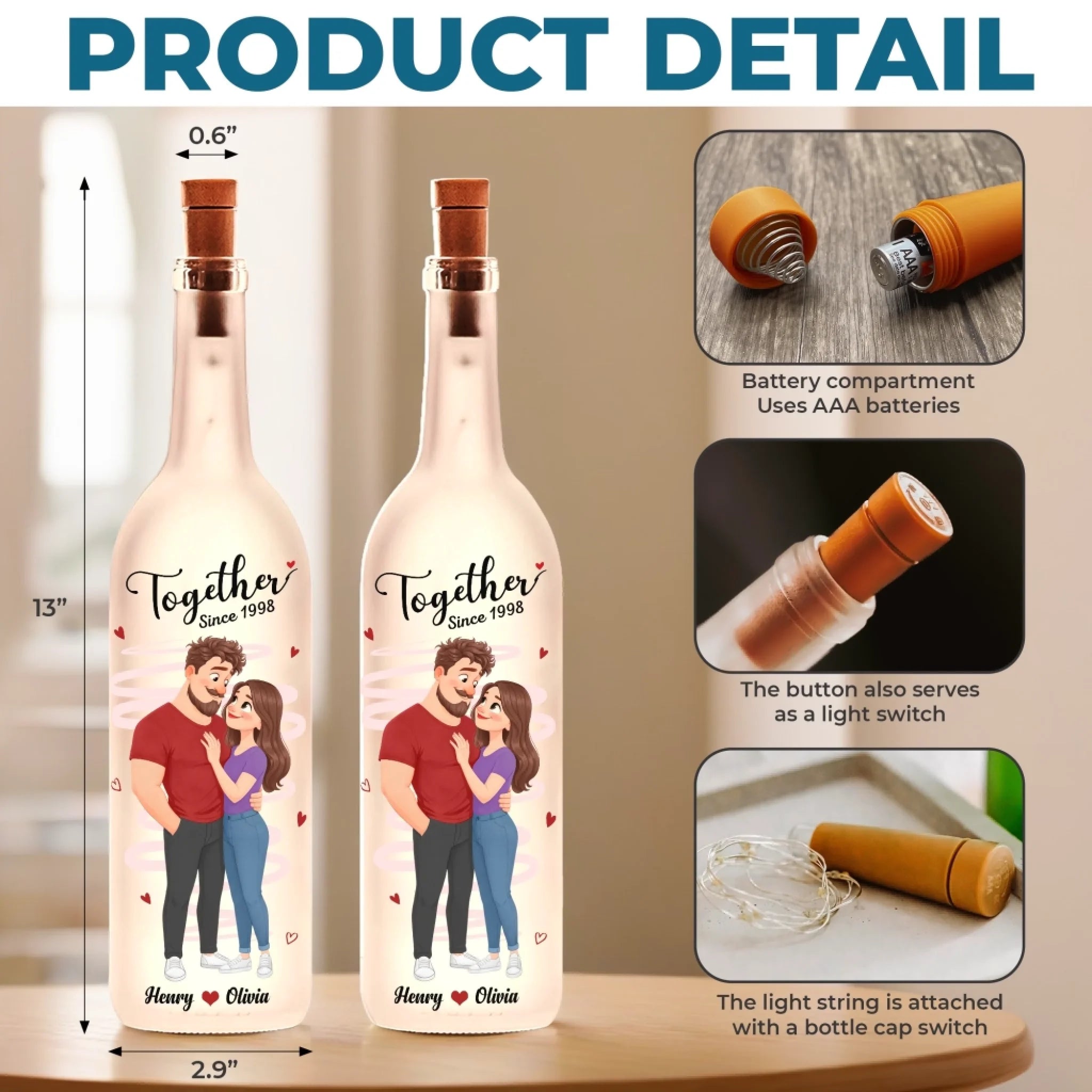 • The lamp is topped with a realistic cork stopper, creating a charming vintage bottle effect. Simply switch it on to enjoy the soft illumination from the fairy lights inside.