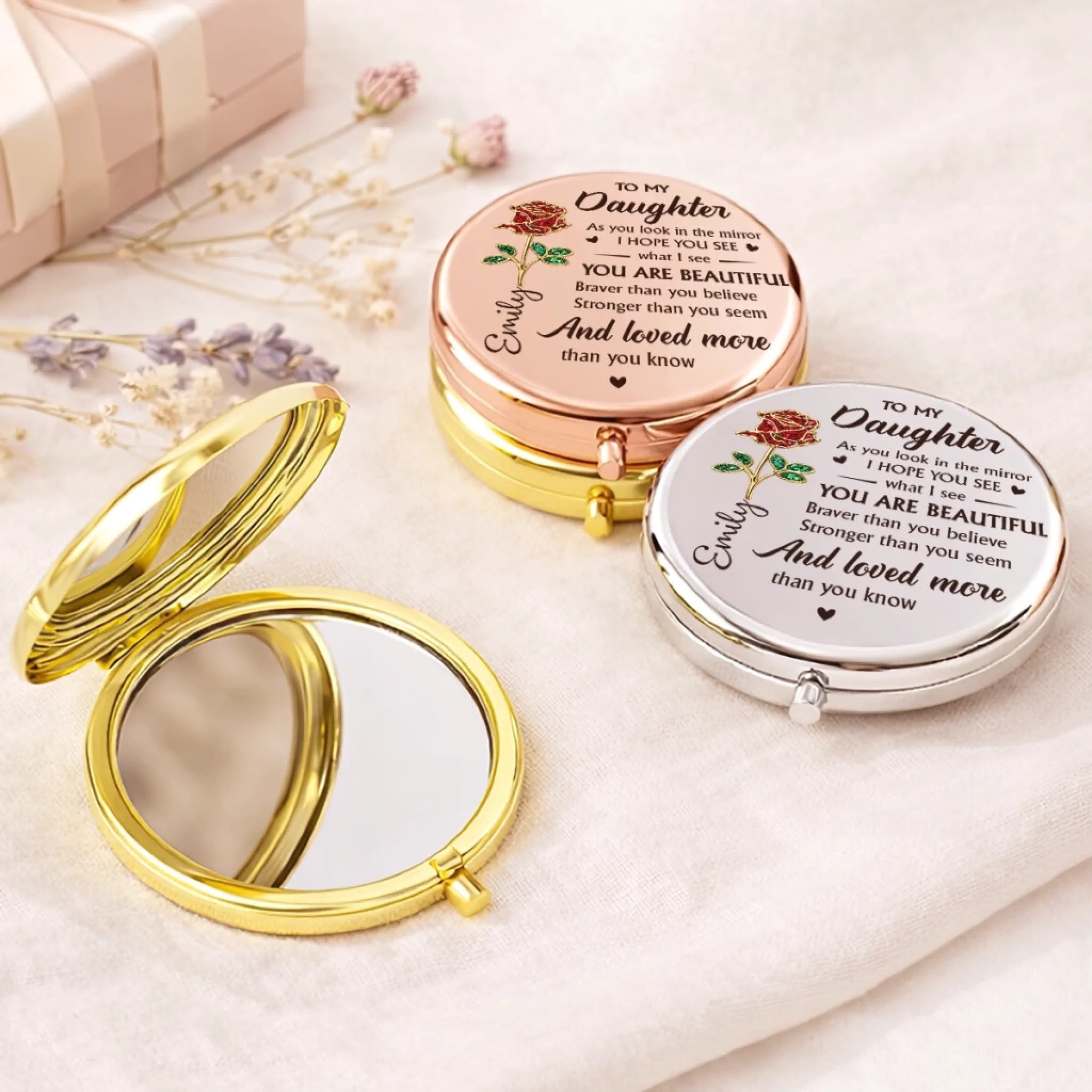 This compact mirror brings a subtle touch of elegance to everyday routines. Featuring a delicate floral design and a timeless look, it is a practical yet charming accessory to carry daily or a thoughtful gift for special moments. This is the perfect gift for anyone, suitable for all occasions: birthdays, holidays, anniversaries, graduations, Valentine’s Day, Mother’s Day, Father’s Day, and just because! Whether for friends, family, or that special someone, this versatile gift is guaranteed to bring joy and make lasting memories.