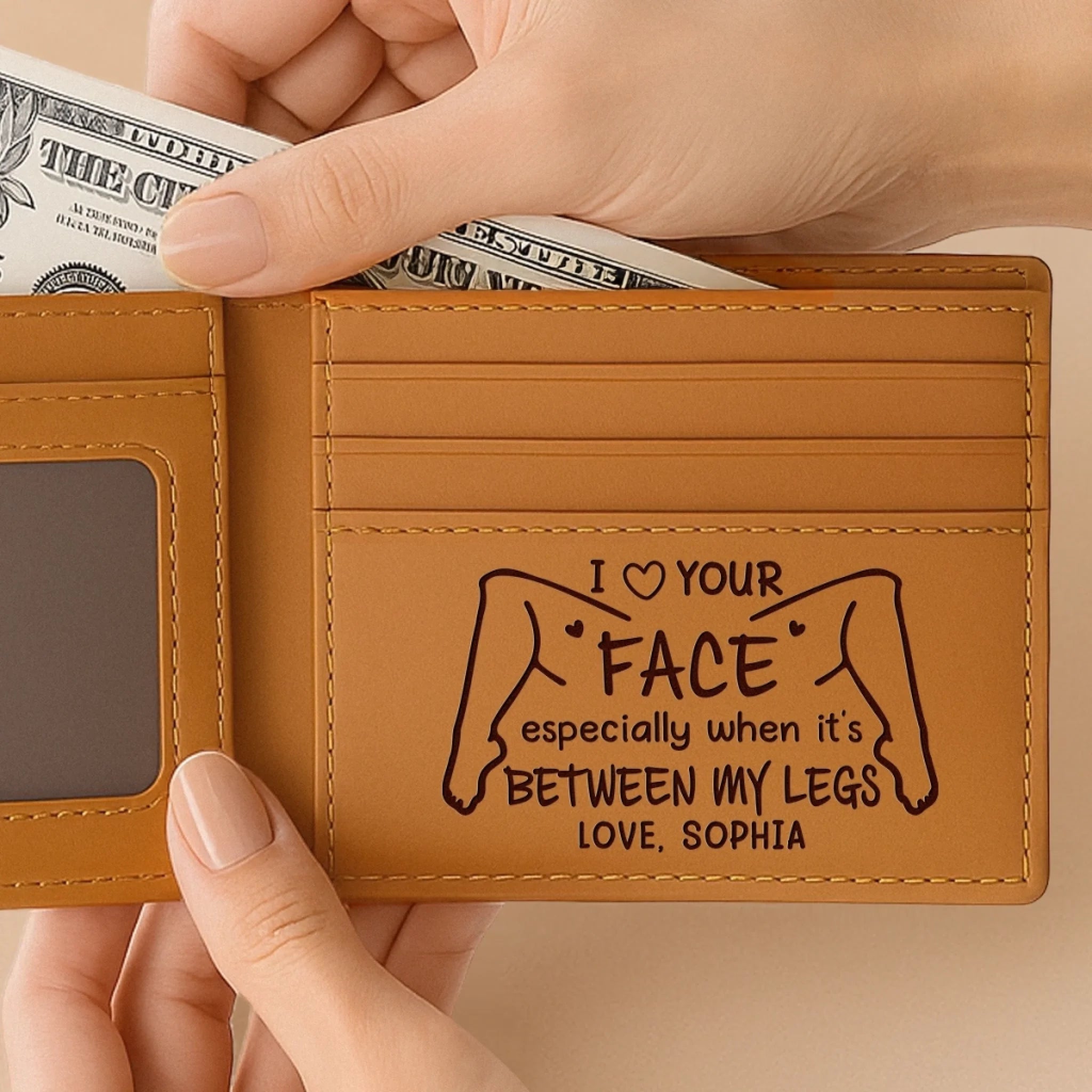 Double-sided engraving — personalized message on both the exterior and interior of the wallet.