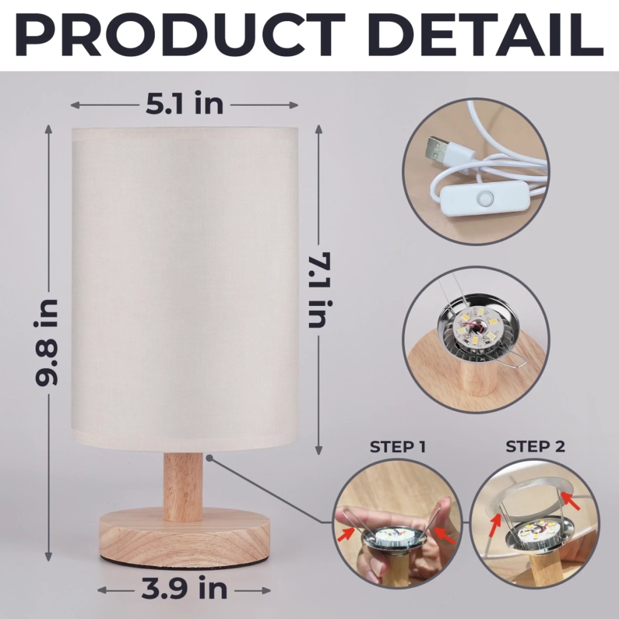 Package includes: 1 fabric lampshade, 1 wooden base, 1 bulb, 1 USB power cable, and 1 box.