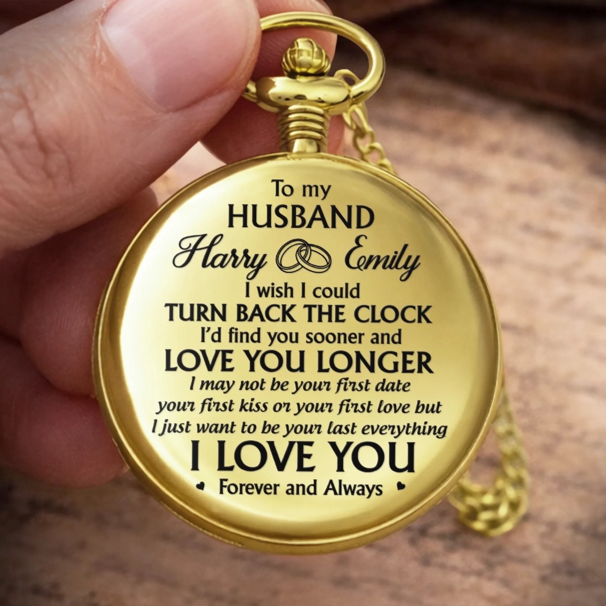 This pocket watch is a timeless keepsake designed to celebrate love and special moments. Featuring a beautifully engraved message on the front, it serves as a meaningful gift that will be treasured for years to come. Whether for an anniversary, wedding, or just to express your heartfelt feelings, this pocket watch offers a thoughtful and lasting alternative to a traditional card. This is the perfect gift for anyone, suitable for all occasions: birthdays, holidays, anniversaries, graduations, Valentine's Day, Mother's Day, Father's Day, and just because! Whether for friends, family, or that special someone, this versatile gift is guaranteed to bring joy and make lasting memories.