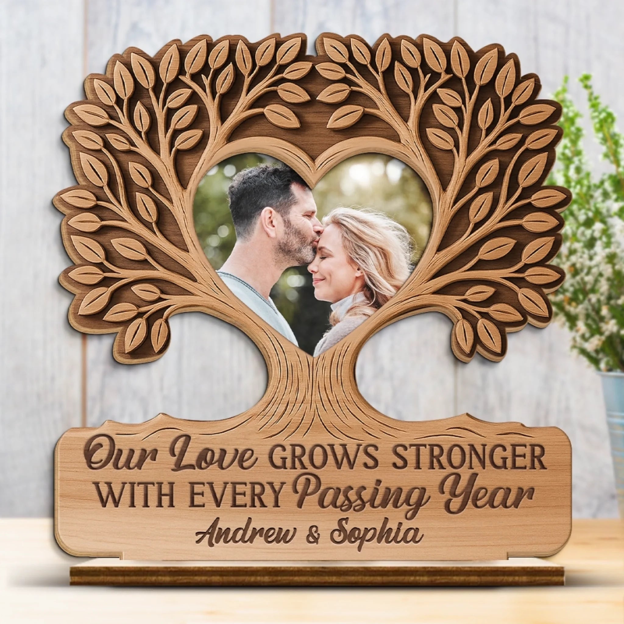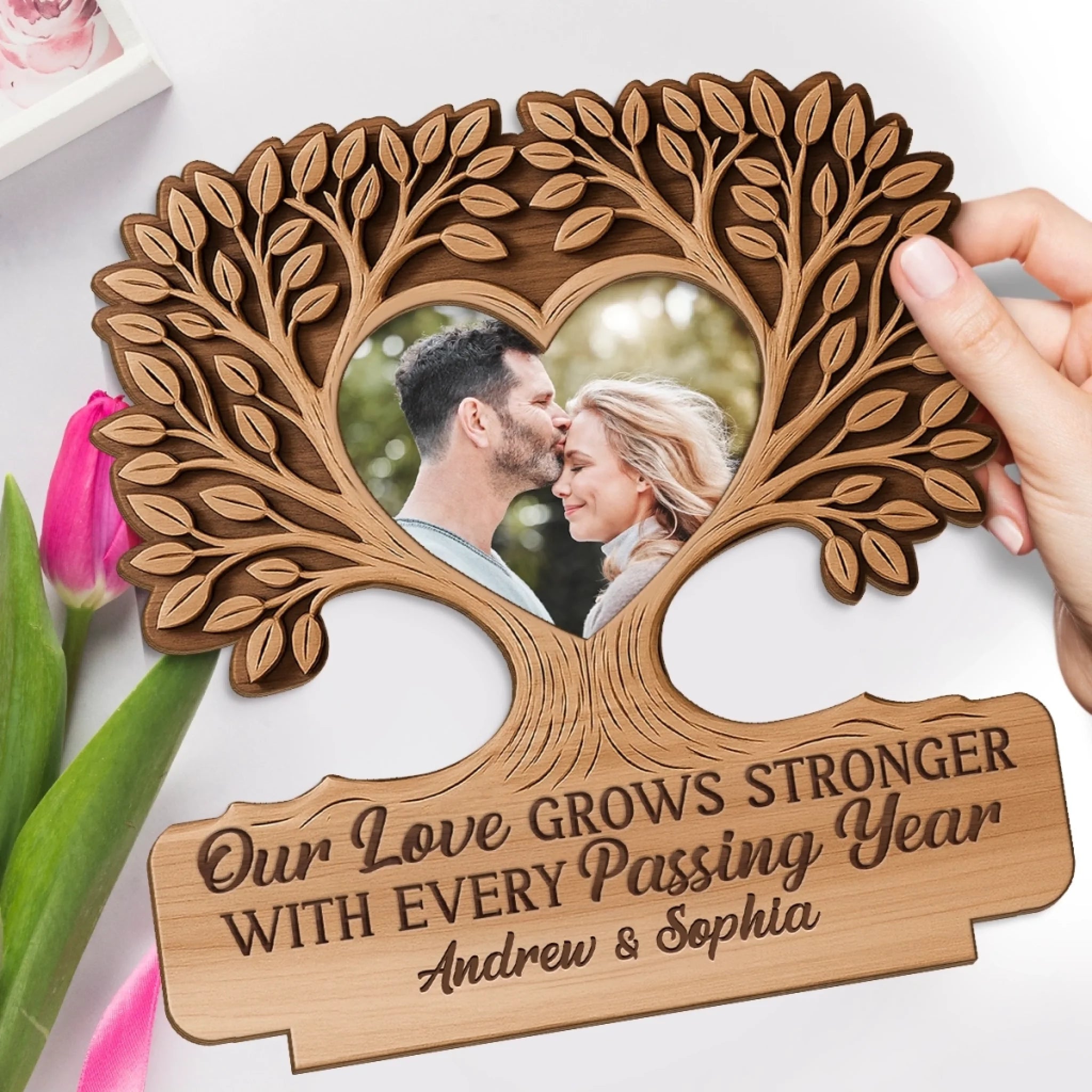 Custom Photo 2-Layered Wooden Plaque - Personalized Anniversary Wedding Gifts For Husband And Wife, Him And Her - Our Love Grows Deeper And Stronger